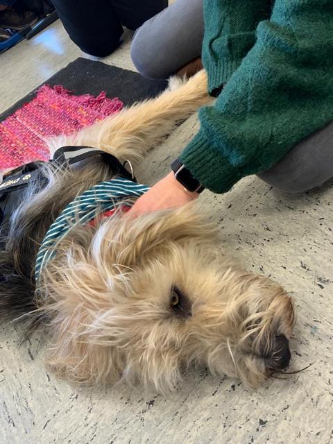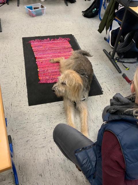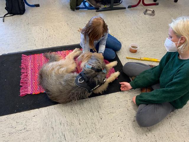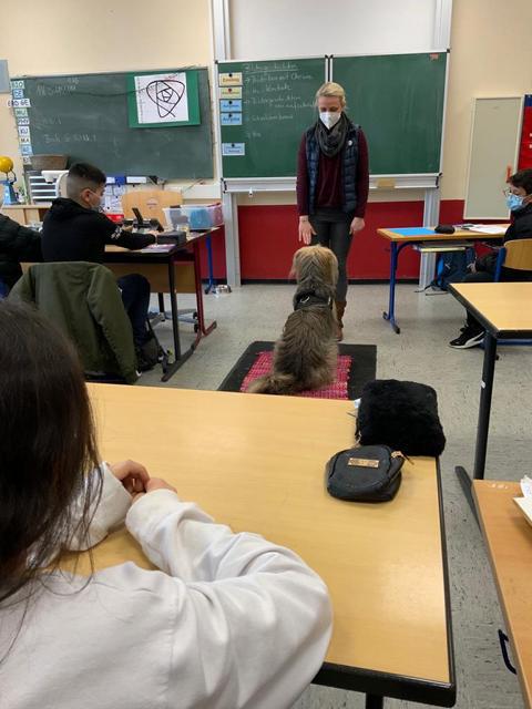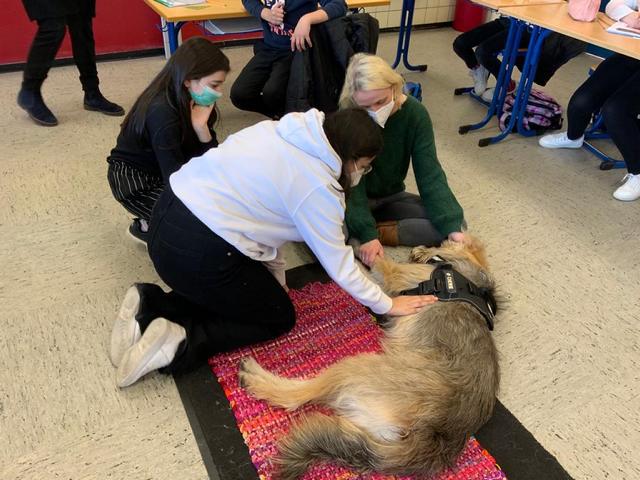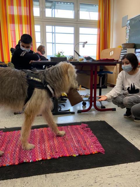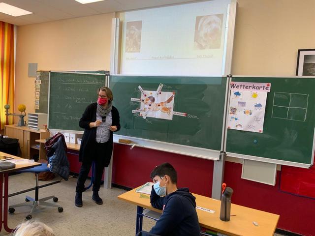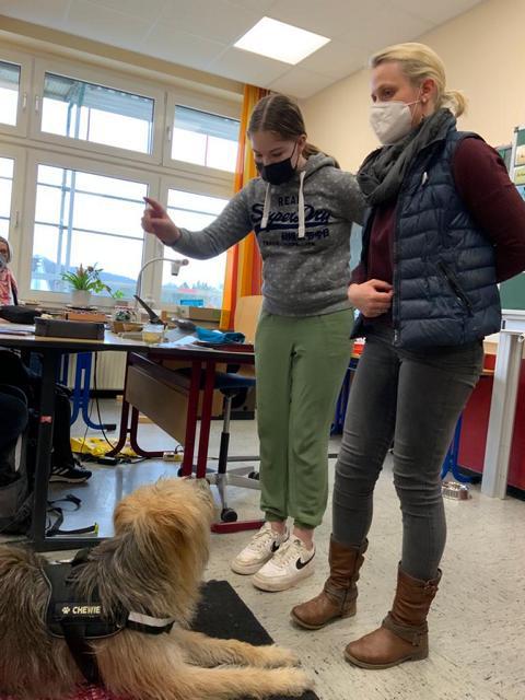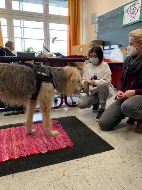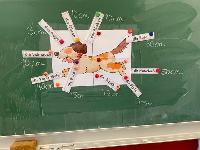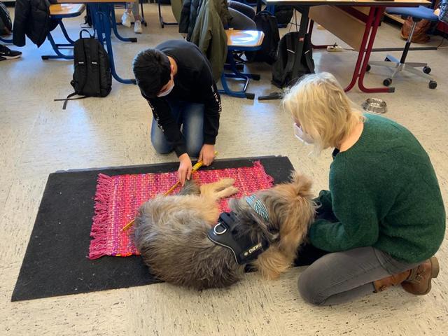 Im Rahmen des Biologieunterrichtes war Chewie heute Hauptperson in der Biologiestunde. Nachdem die Schüler die Körperteile des Hundes benannt hatten, durften die Schüler gemeinsam mit Frau Gutsche die Körperteile ausmessen. Chewie lag die ganze Zeit sehr entspannt auf der Decke und genoss die Streicheleinheiten, die es zur Belohnung für seine Geduld gab.