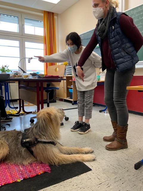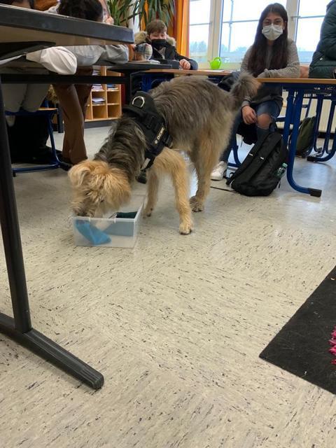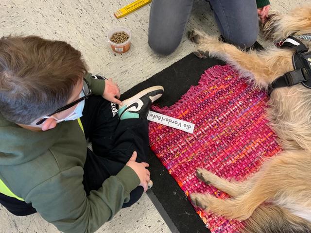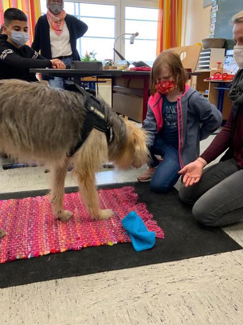 Heute war Chewie in der 5a und hat gemeinsam mit Frau Gutsche den Deutschunterricht gestaltet. Chewies Aufgabe war es Beutel aus der Kiste zu holen. In diesen Beuteln befanden sich kleine Aufgaben für die Schüler. Nachdem Frau Gutsche die Befehle für das Holen der Beutel erklärt hatte, konnten die Schüler den Hund selber losschicken um einen Beutel mit einer Aufgabe zu holen. Chewie war sehr motiviert und holte einen Beutel nach dem anderen aus der Kiste.